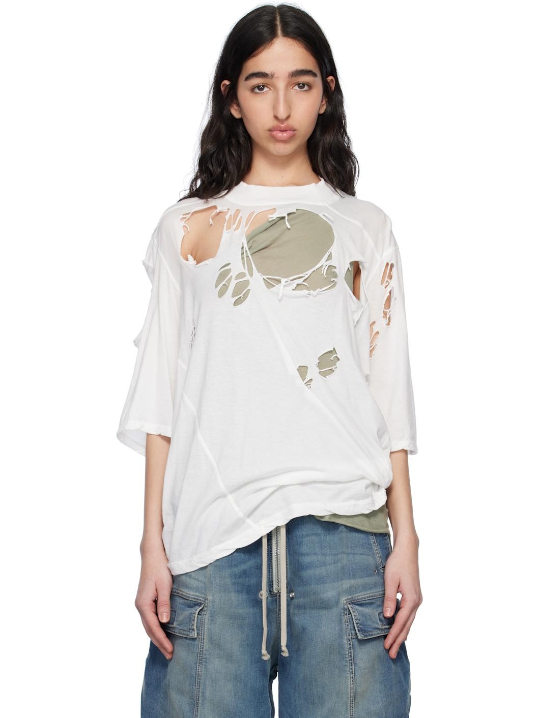 GOTS-certified organic cotton jersey T-shirt. Distressing throughout. · Raw edge at rib-knit crewneck and hem · Dropped saddle shoulders · Central seam at back · Logo-woven webbing strap at interior Supplier color: Milk 100% organic cotton. Made in Italy 251126F110010