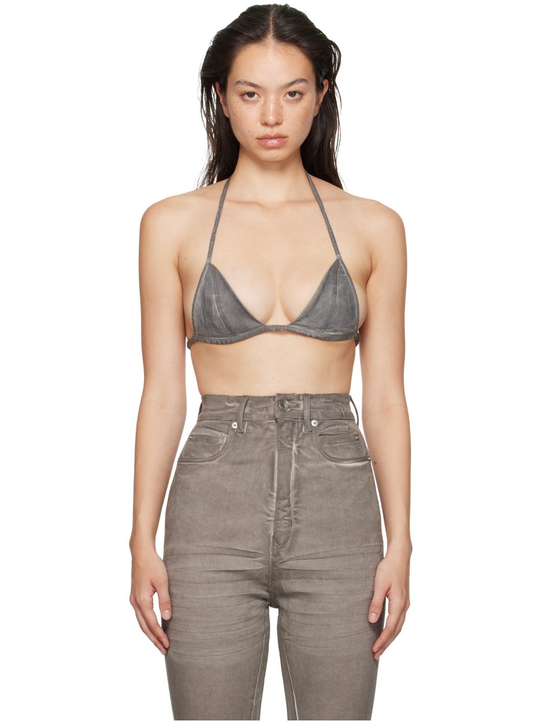 Foil-coated lightweight stretch denim bra. · Overdyed · ZDHC-certified · V-neck · Self-tie halter strap · Elasticized hook-eye strap at back · Cotton twill lining Supplier color: Pearl Body: 85% cotton, 10% polyester, 5% elastane. Lining: 100% cotton. Made in Italy 242126F073003