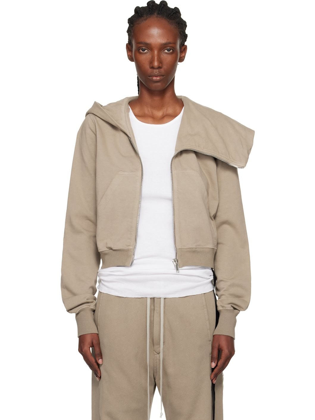 GOTS-certified organic cotton fleece hoodie. · Garment-dyed · Offset zip closure · Patch pockets at front · Rib-knit hem and cuffs · Central seam at back · Integrated logo-woven strap at interior Supplier color: Dirty pearl 100% cotton. Made in Italy 252126F097009