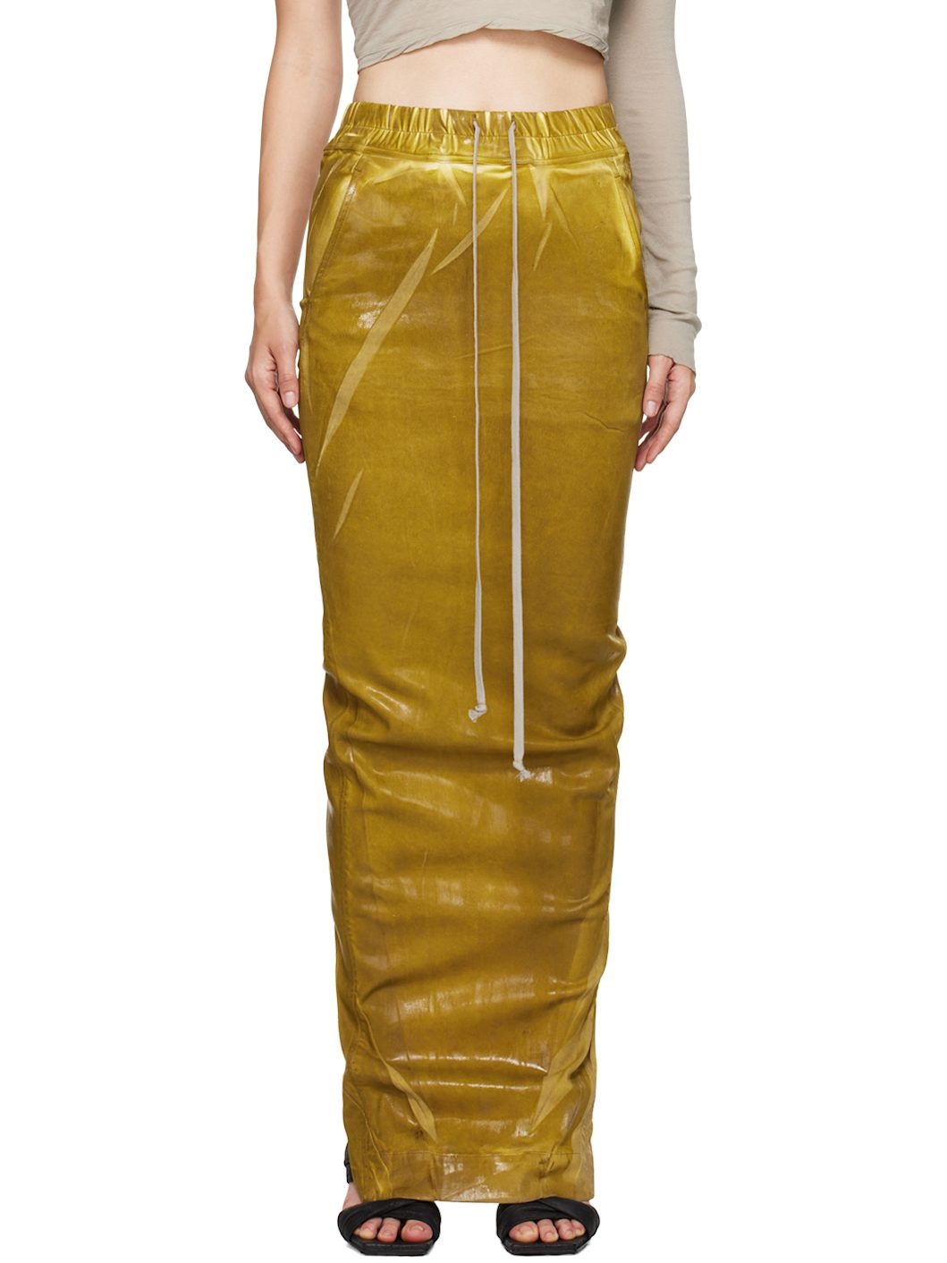 Overdyed and foil-coated lightweight stretch denim maxi skirt. · ZDHC-certified · Drawstring at elasticized poplin waistband · Two-pocket styling · Slit at back hem Supplier color: Ochre Body: 85% cotton, 10% polyester, 5% elastane. Lining: 100% cotton. Made in Italy 242126F093008