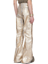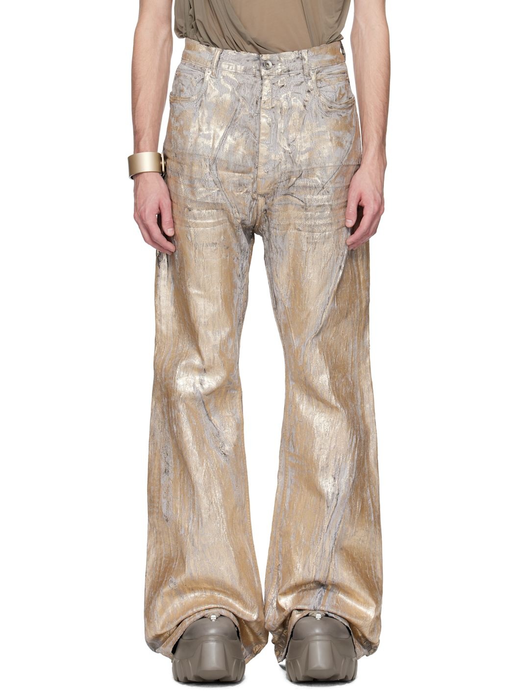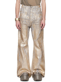 Foil-coated and cracked stretch denim jeans. Smudging throughout. · Belt loops · Five-pocket styling · Zip fly · Extended legs Supplier color: Gold Body: 91% cotton, 6% elastomultiester, 3% rubber fibre. Lining: 100% cotton. Made in Italy 251232M186021