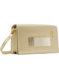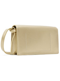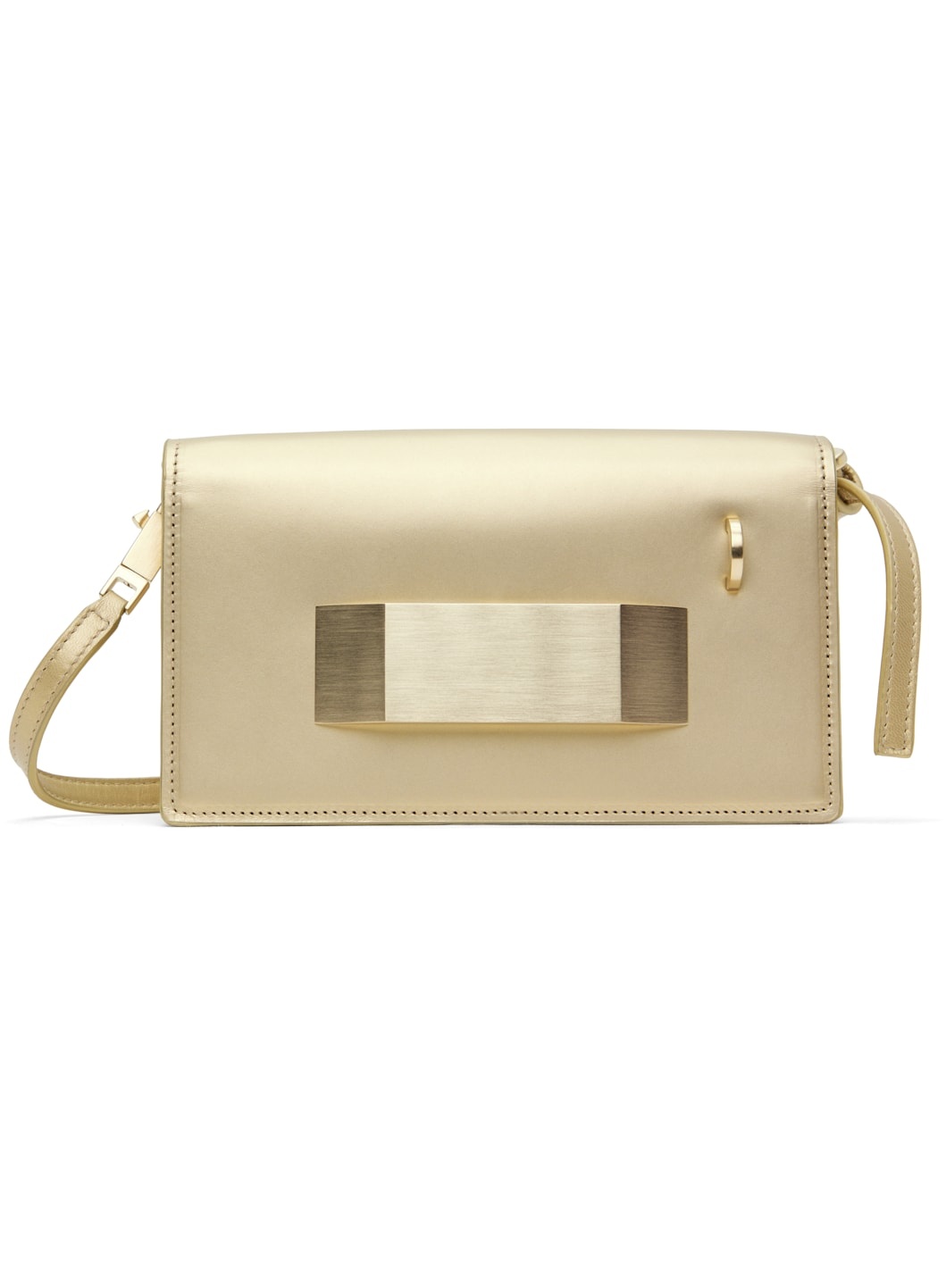 Heavyweight vegetable-tanned buffed leather messenger bag in metallic gold tone. · Adjustable and detachable crossbody strap · Logo-engraved plaque and D-ring at face · Topstitching at back face · Magnetic flap · Zip pocket at two-compartment interior · Patch pocket and note slot · Seven card slots · Grained leather lining · H5" x W8.5" x D2" Supplier color: Gold Leather. Made in Italy 251232M170037