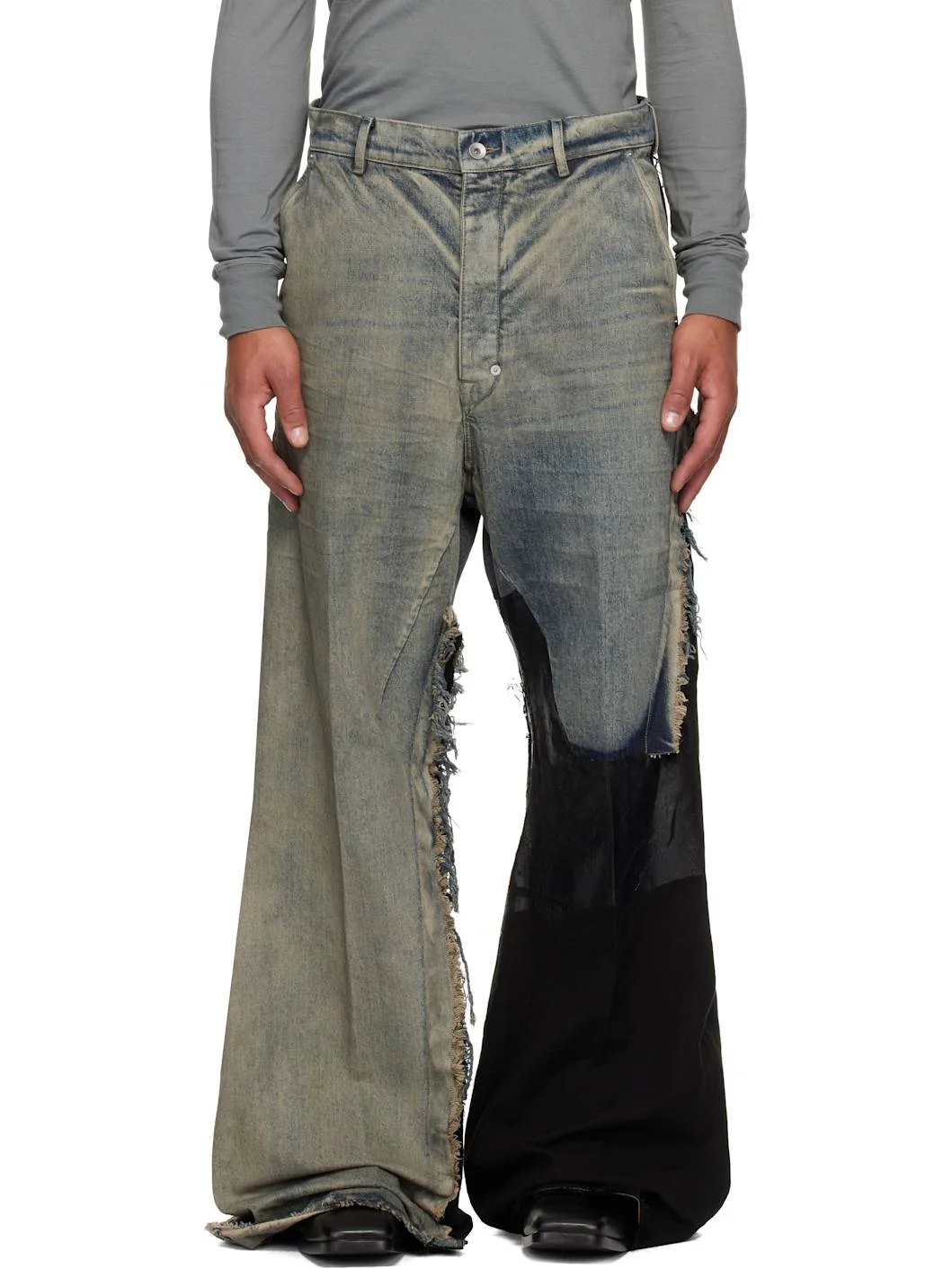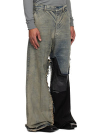 Slub 14 oz non-stretch organic cotton denim and poplin jeans. · GOTS- and ZDHC-certified · Paneled construction · Fading, whiskering, and frayed edges throughout · Belt loops · Two-pocket styling · Button fly · Creased legs · Silver-tone hardware Supplier color: Dirty hustler/Black Body: 100% cotton. Trim: 52% polyester, 48% cotton. Made in Italy 252232M186022