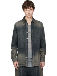 Slub 14 oz non-stretch organic cotton denim shirt. · GOTS-certified organic cotton · Stonewashed and hand-sprayed · Fading throughout · Spread collar · Press-stud closure · Welt pockets at chest · Shirttail hem · Pleats at press-stud barrel cuffs · Riveted webbing strap at back Supplier color: Dark dust degrade Body: 100% cotton. Pocket lining: 52% polyester, 48% cotton. Made in Italy 252232M192026