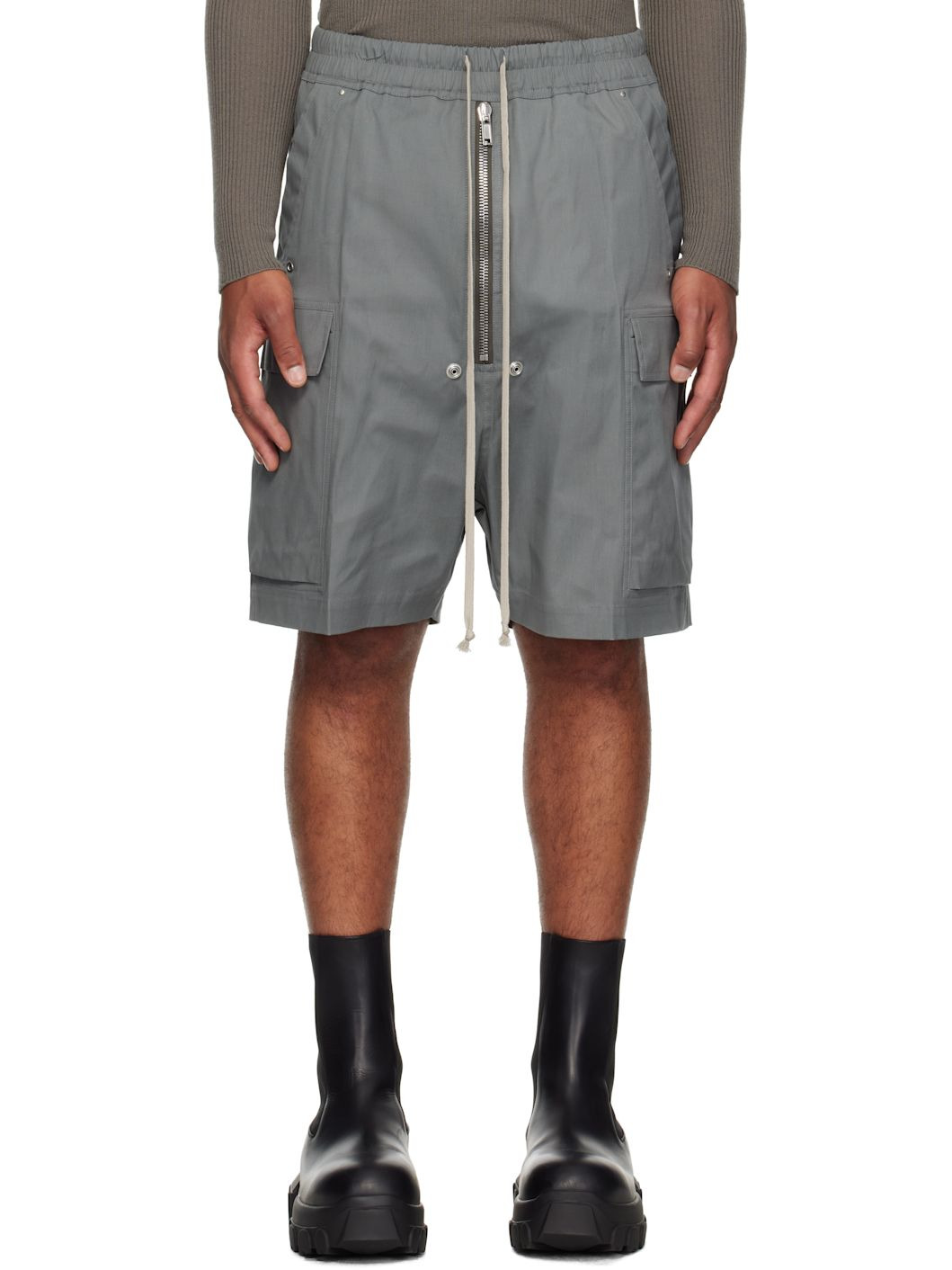 Stretch organic cotton poplin cargo shorts. · GOTS-certified organic cotton · Drawstring at elasticized waistband · Four-pocket styling · Exposed zip fly · Studs, rivets, and grommets at front · Cargo pocket at legs Supplier color: Washed indigo 97% organic cotton, 3% elastane. Made in Italy 252232M193020