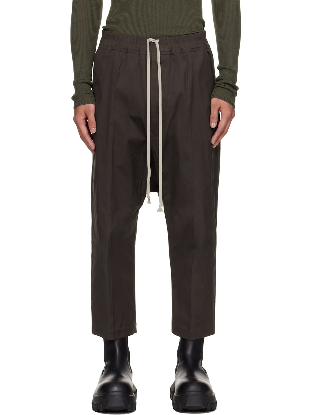 Stretch cotton canvas trousers. · Drawstring at elasticized waistband · Four-pocket styling · Button fly · Gusset at dropped inseam · Cropped leg Supplier color: Dark dust 97% cotton, 3% elastane. Made in Moldova 252232M191044