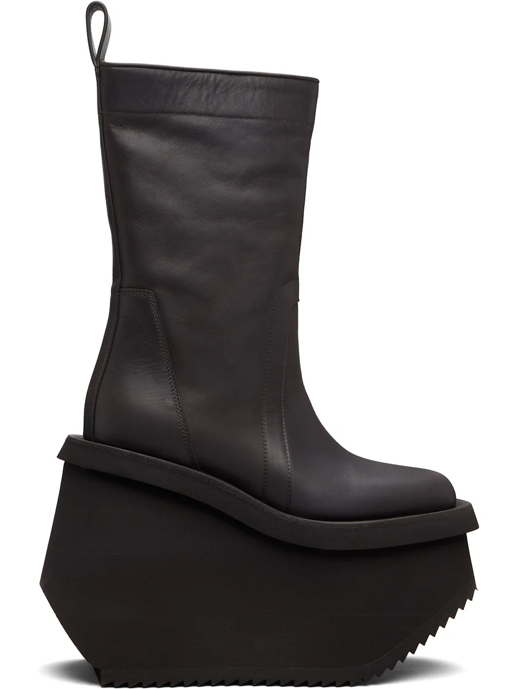 Mid-calf buffed leather boots. · Square toe · Pull-loop at heel collar · Suede lining · Foam rubber platform midsole · Treaded rubber sole · Platform: H4" · Heel: H5.5" Supplier color: Dark dust Upper: leather. Sole: rubber. Made in Italy 252232F113009