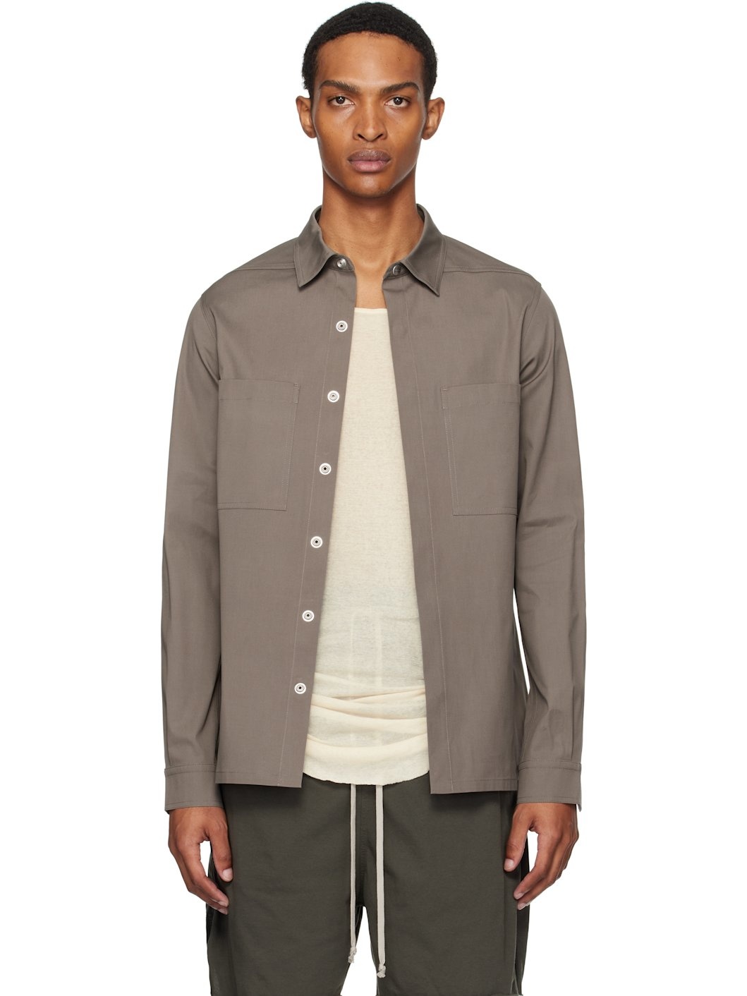 Stretch GOTS-certified organic cotton poplin shirt. · Spread collar · Press-stud closure · Patch pockets · Shirttail hem · Press-stud barrel cuffs · Webbing strap at back yoke Supplier color: Dust 97% organic cotton, 3% elastane. Made in Italy 252232M192013
