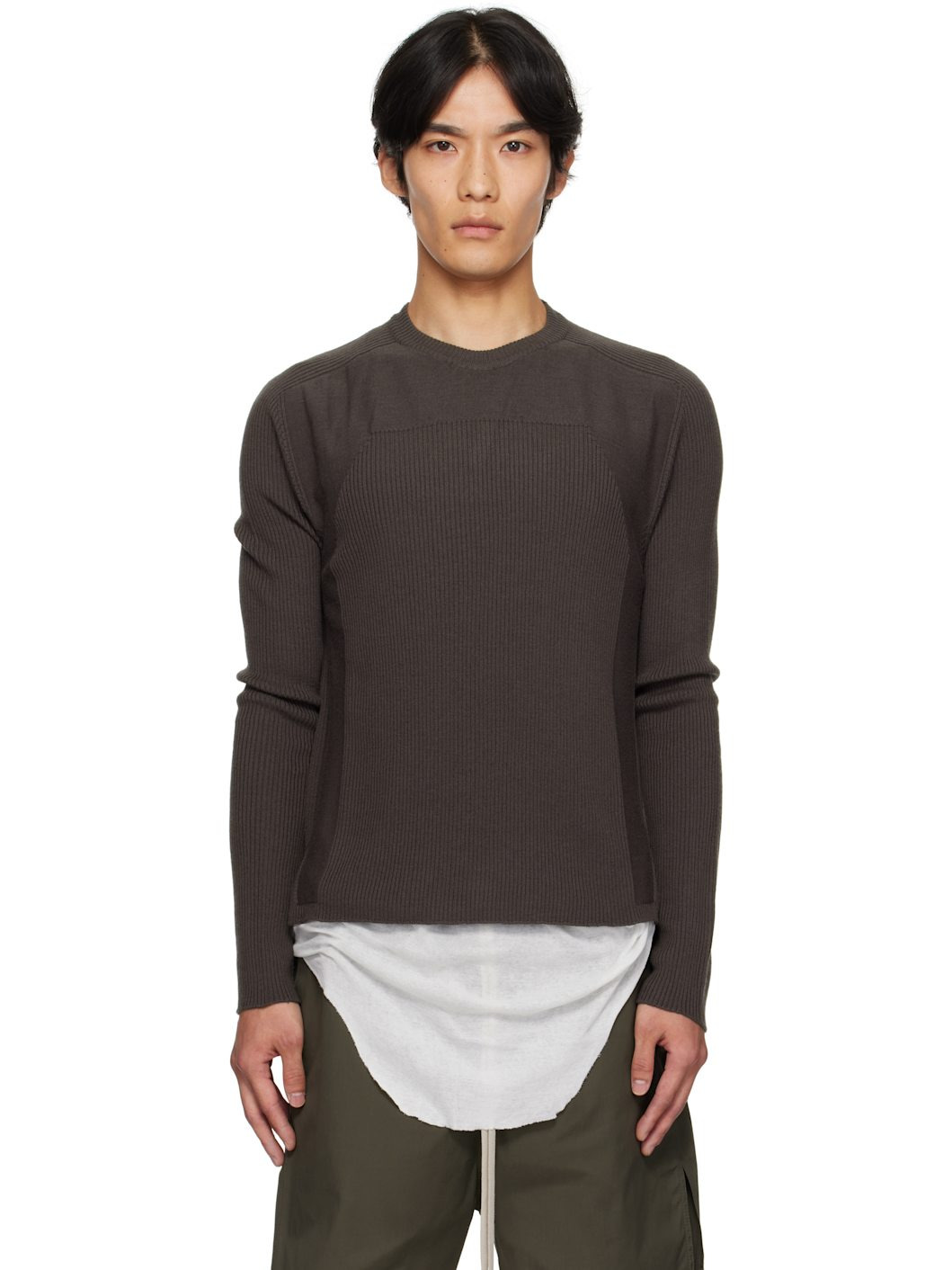 Rib-knit virgin wool sweater. · Crewneck · Reverse-knit panel at front · Tennis-tail hem · Saddle shoulders · Central garter stitch stripe at back Supplier color: Dark dust 100% virgin wool. Made in Italy 252232M201019
