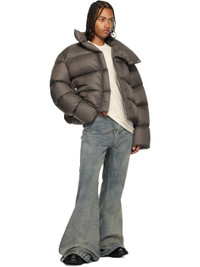 Down-filled and quilted recycled nylon satin jacket. · GRS-certified recycled nylon · Press-stud fastening at funnel neck · Offset zip closure · Welt pockets at waist · Cropped hem · Inset rib-knit cuffs · Riveted webbing strap at back · Zip pockets at interior · Fully lined · Logo-engraved silver-tone hardware Supplier color: Darkdust Body: 100% polyamide. Trim 1: 100% virgin wool. Trim 2: 97% cotton, 3% elastane. Fill: 90% goose down, 10% mallard feathers. Made in Italy 252232M178009