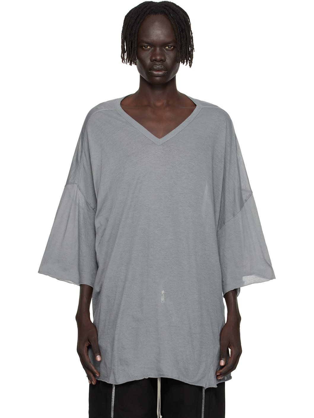 Semi-sheer organic cotton jersey T-shirt. · GOTS-certified organic cotton · Rib-knit V-neck · Raw edge at hem and cuffs · Twisted side seams · Offset seam at dropped shoulders Supplier color: Washed indigo 100% organic cotton. Made in Italy 252232M213158