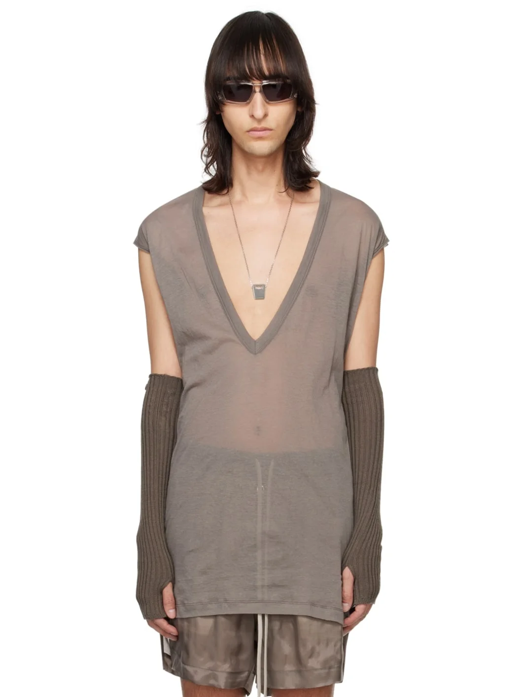 Lightweight semi-sheer GOTS-certified organic cotton jersey T-shirt. · Rib knit plunging V-neck · Rolled edge at cap sleeves · Central seam at back Supplier color: Dust
