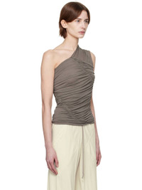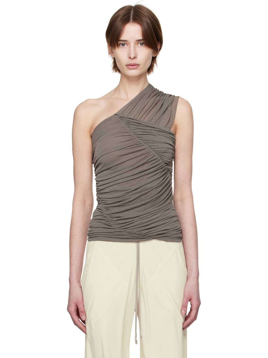 Semi-sheer ECOVERO™-certified viscose crepe jersey top. Gathering and draping throughout. · Single-shoulder construction · Raw edge at hem Supplier color: Dust 100% viscose. Made in Italy 251232F111046