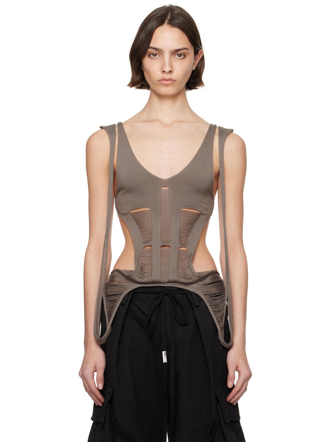 Knit virgin wool tank top. Laddering throughout. · Rolled edge at plunging V-neck, hem, and armscyes · Extended trims at hem · Cutout at sides · Low back Supplier color: Dust 100% virgin wool. Made in Italy 251232F111096