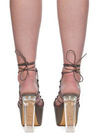 Buffed lambskin heeled sandals. · Open square toe · Knotted straps at vamp · Wraparound self-tie ankle strap · Logo embossed at molded calfskin footbed · Transparent block heel · Covered platform midsole · Leather sole with treaded rubber injection · Platform: H2.5" · Heel: H5.25" Supplier color: Dust/Clear Upper: lambskin. Sole: leather, rubber. Made in Italy 251232F125012