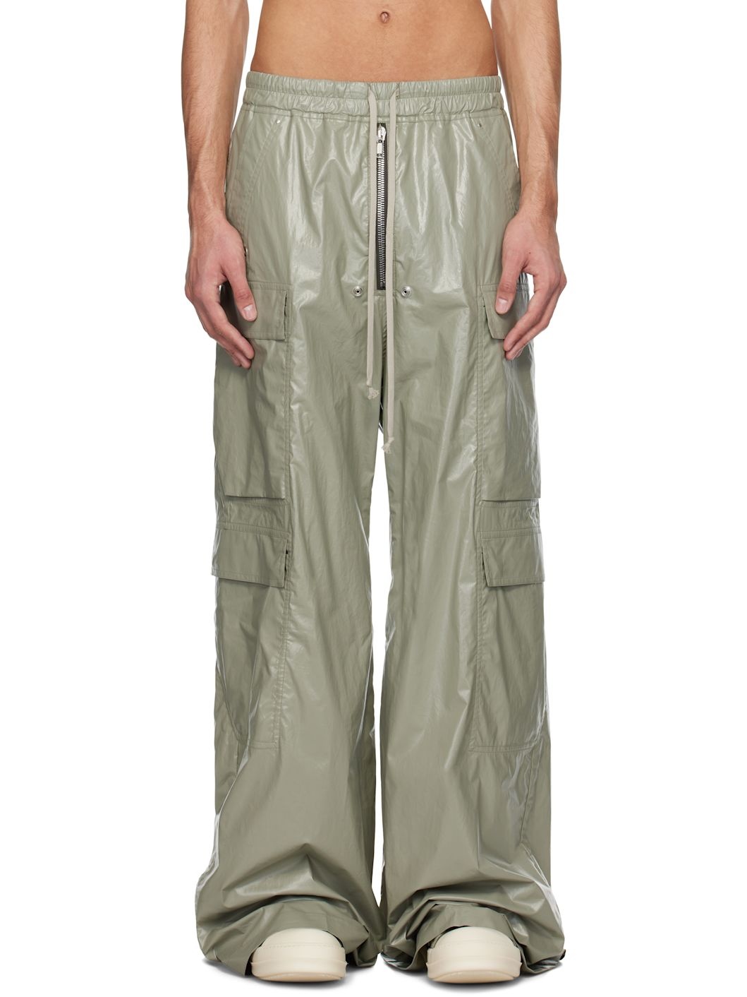 Coated cotton jersey cargo pants. · Drawstring at elasticized waistband · Four-pocket styling · Exposed zip fly · Rivets, eyelets, and press-stud hardware at front · Cargo pockets at outseams Supplier color: Celadon 100% cotton. Made in Italy 251232M188007