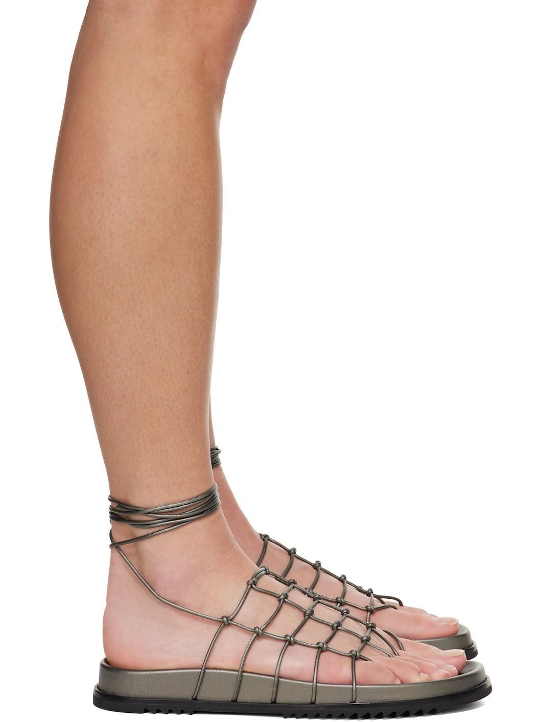 Lightweight coated peached lambskin sandals in gunmetal tone. · LWG-certified lambskin · Open toe · Crisscrossing and knotted straps at vamp · Wraparound self-tie ankle strap · Logo embossed at molded lambskin footbed · Treaded rubber sole Supplier color: Gunmetal Upper: lambskin. Sole: rubber. Made in Italy 251232F124000