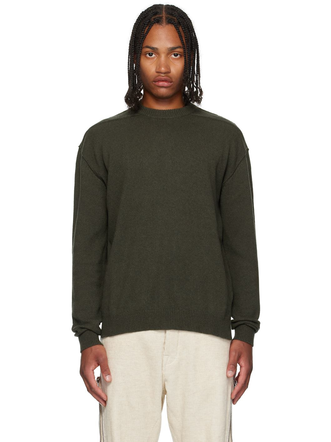 Knit boiled recycled cashmere sweater. · Rib-knit round neck, hem, and cuffs · Tennis-tail hem · Exposed seams at saddle shoulders · Central vent at back Supplier color: Bosco 100% recycled cashmere. Made in Italy 252232M201003