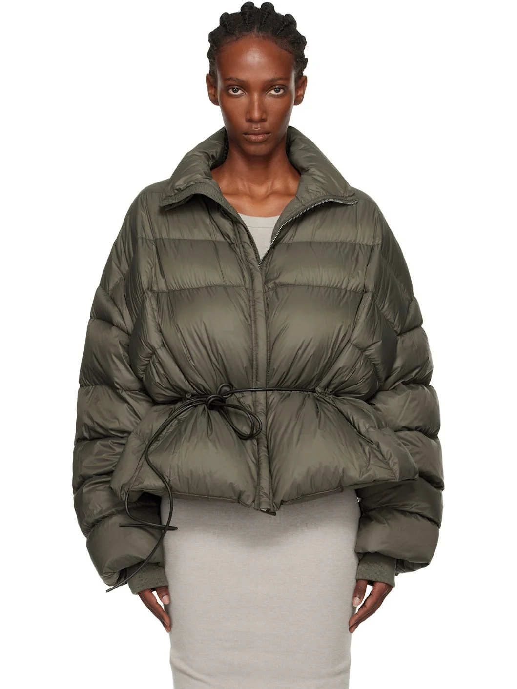 Down-filled and quilted recycled nylon satin jacket. · GRS-certified recycled nylon · Funnel neck · Zip closure · Welt pockets and leather self-tie drawstring at waist · Dropped shoulders · Inset rib-knit cuffs · Concealed zip vent at back collar · Zip pockets at interior · Full nylon satin lining Supplier color: Green Body: 100% recycled polyamide. Trim 1: 100% leather. Trim 2: 100% virgin wool. Trim 3: 97% cotton, 3% elastane. Fill: 90% goose down, 10% mallard feathers. Made in Italy 252232F061011