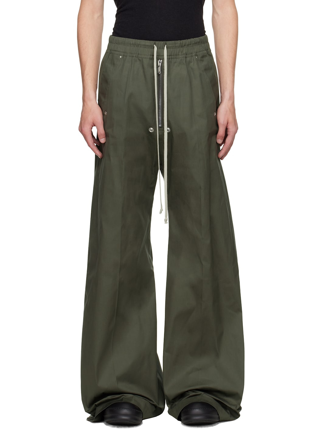 Stretch cotton canvas trousers. · Wide-leg · Drawstring at elasticized waistband · Four-pocket styling · Exposed zip fly · Rivets, grommets, and press-stud hardware at front · Creased legs · Dropped inseam · Silver-tone hardware Supplier color: Bosco 97% cotton, 3% elastane. Made in Italy 252232M191031