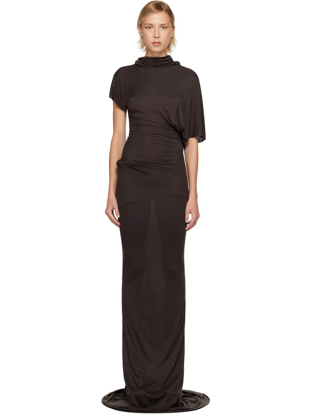Semi-sheer viscose jersey maxi dress. · Asymmetrical draped construction · Cowl neck · Twisted detailing at waist · Train at back hem Supplier color: Raisin 100% viscose. Made in Italy 252039F055014