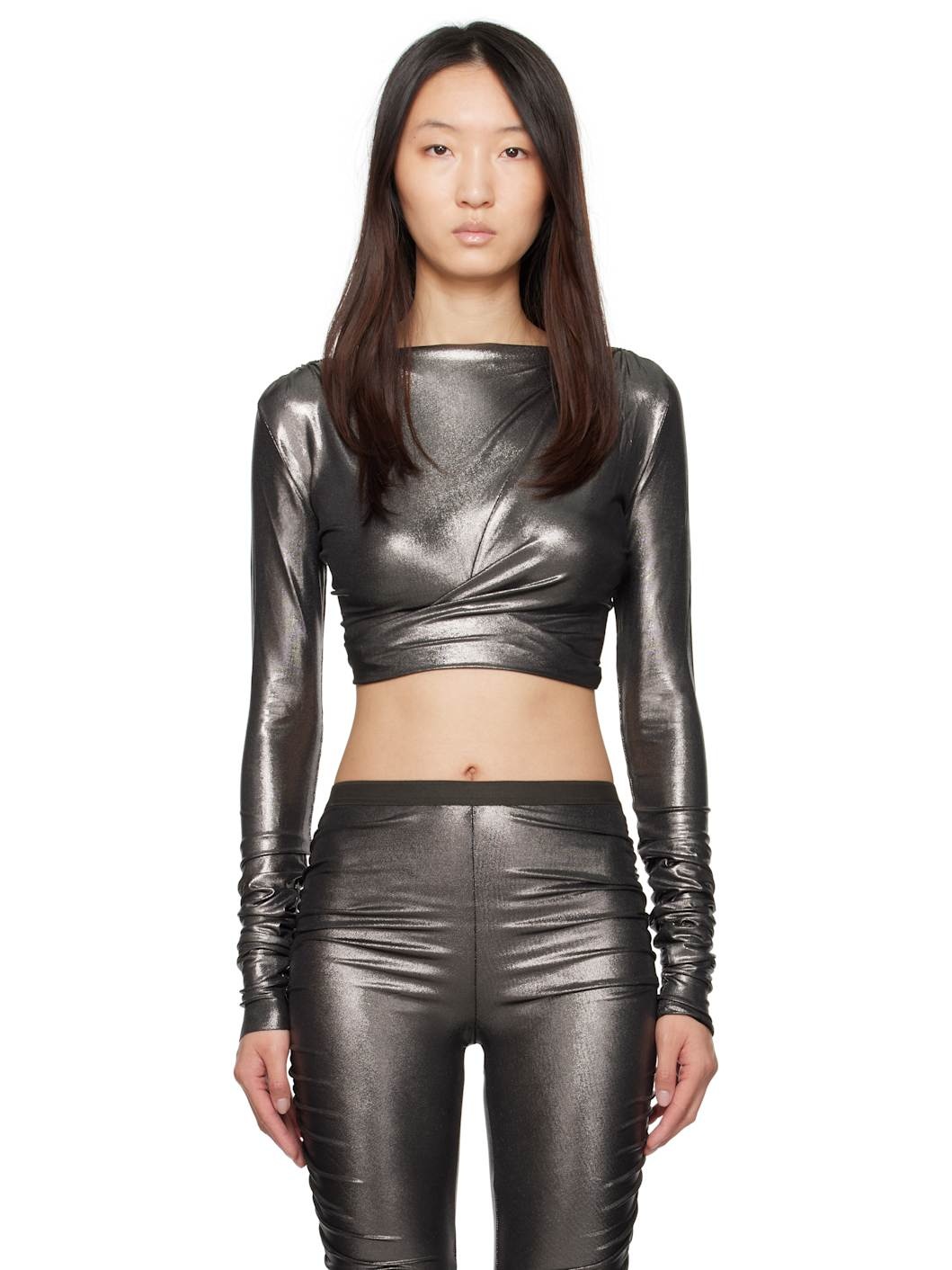 Foil-coated stretch viscose jersey top. Gathering and twisted seams throughout. · FSC®-certified viscose · Boatneck · Cropped hem · Ruching at shoulders · Cutout and twisted detailing at low back Supplier color: Gunmetal 94% viscose, 6% elastane. Made in Italy 251039F110022