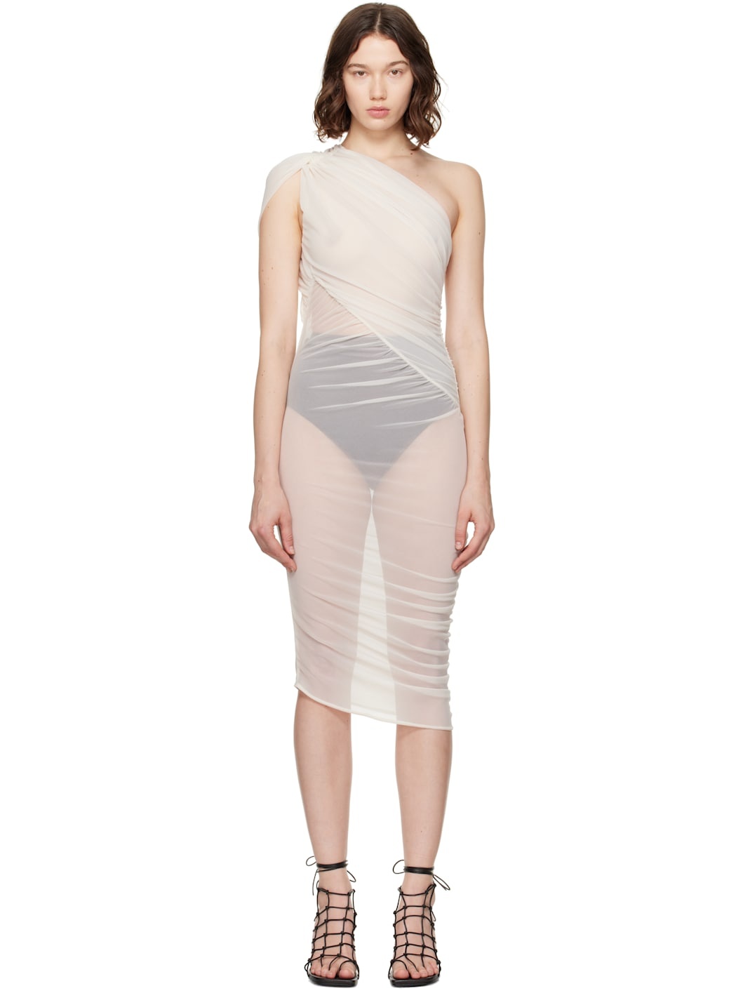 Sheer polyester organza minidress. · Gathering throughout · Single-shoulder construction · Ruching at side seam extends to front · Unlined Supplier color: Dove 100% polyester. Made in Italy 251039F052002