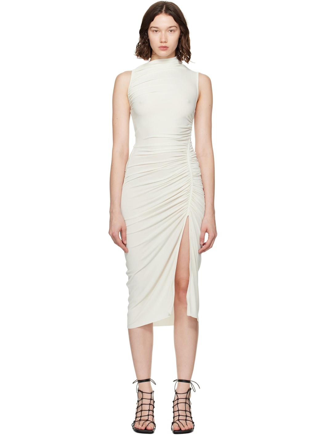 Sheer polyester organza midi dress. · Asymmetrical construction · Draped neck · Offset slit at front · Raw edge at hem · Ruching at side seam and shoulder · Unlined Supplier color: Dove 100% polyester. Made in Italy 251039F054001