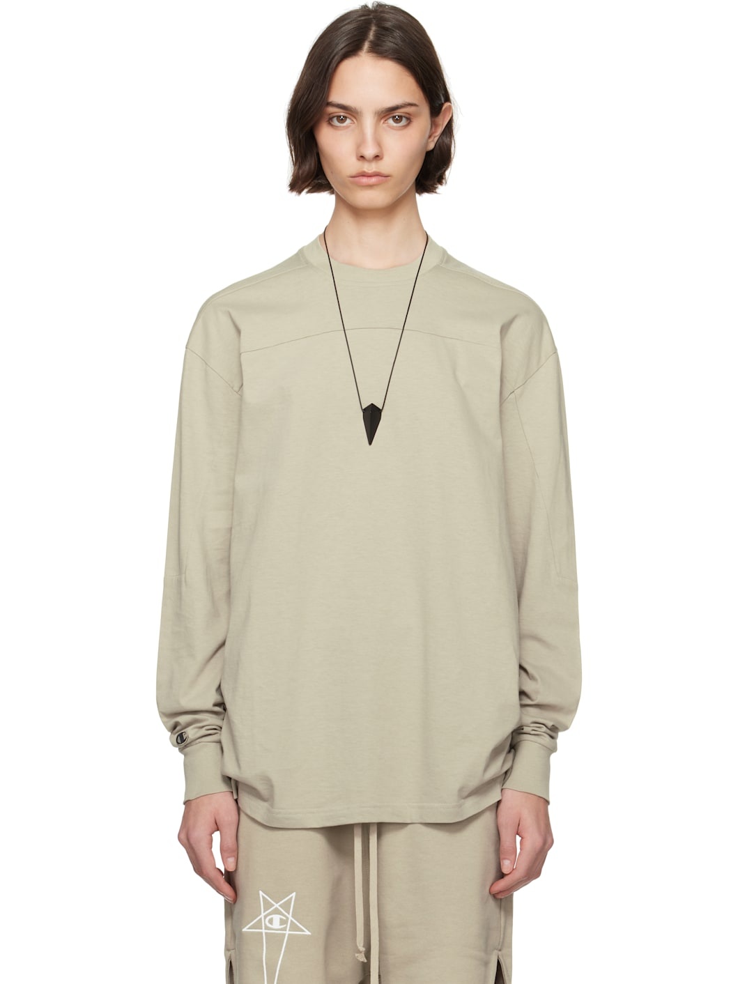 GOTS-certified organic cotton jersey T-shirt. · Rib-knit crewneck and cuffs · Yoke sleeves · Embroidered logo patch at cuff · Central seam at back Part of the Rick Owens x Champion collaboration. Supplier color: Pearl Body: 100% organic cotton. Trim: 95% cotton, 5% elastane. Made in Italy 252232F098005