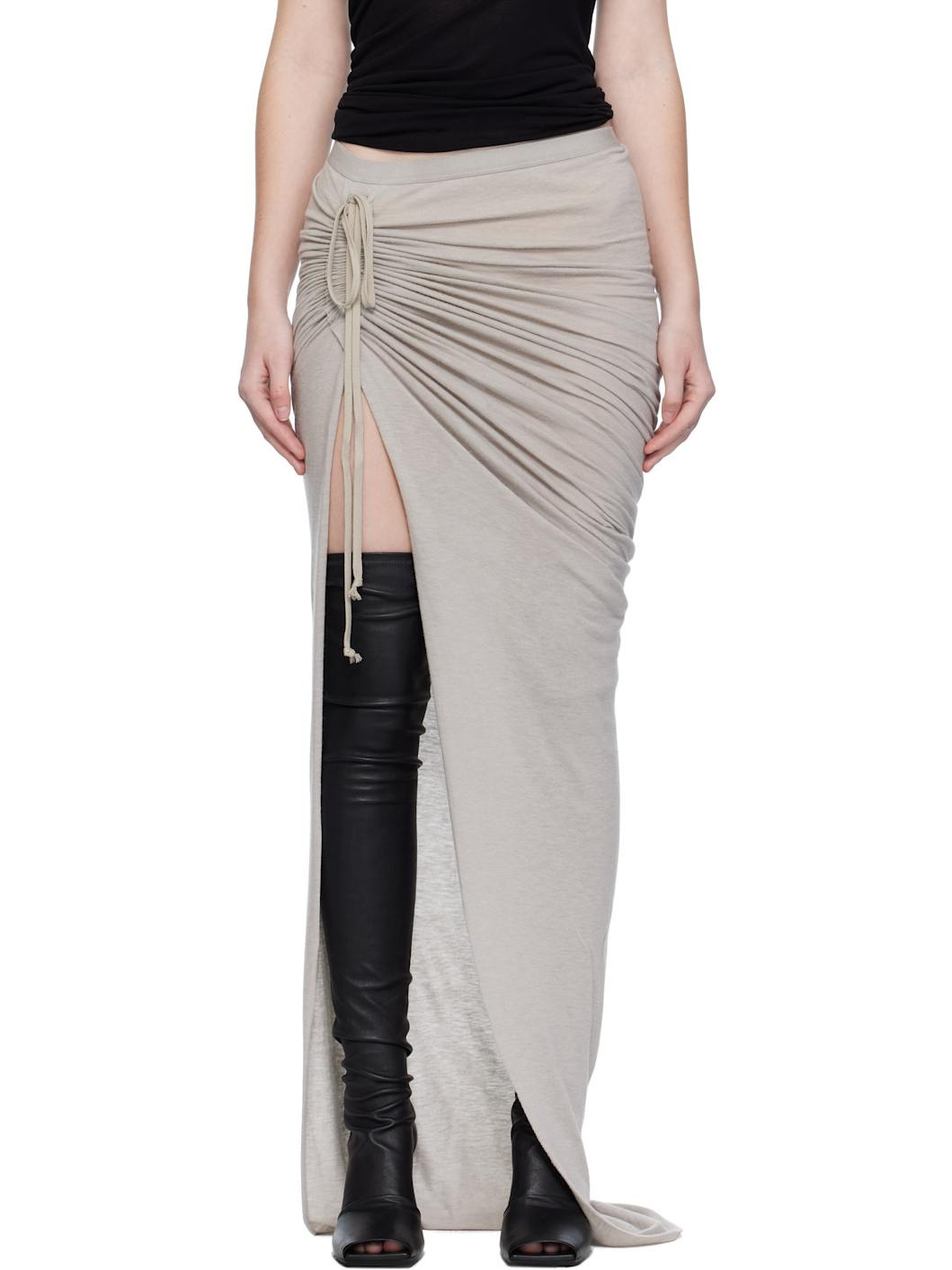 Viscose- and angora wool-blend jersey maxi skirt. · Semi-sheer · Elasticized waistband · Drawstring, ruching, and slit at side seam · Train at back hem Supplier color: Pearl 30% polyamide, 30% viscose, 20% angora wool, 20% wool. Made in Italy 252232F093002