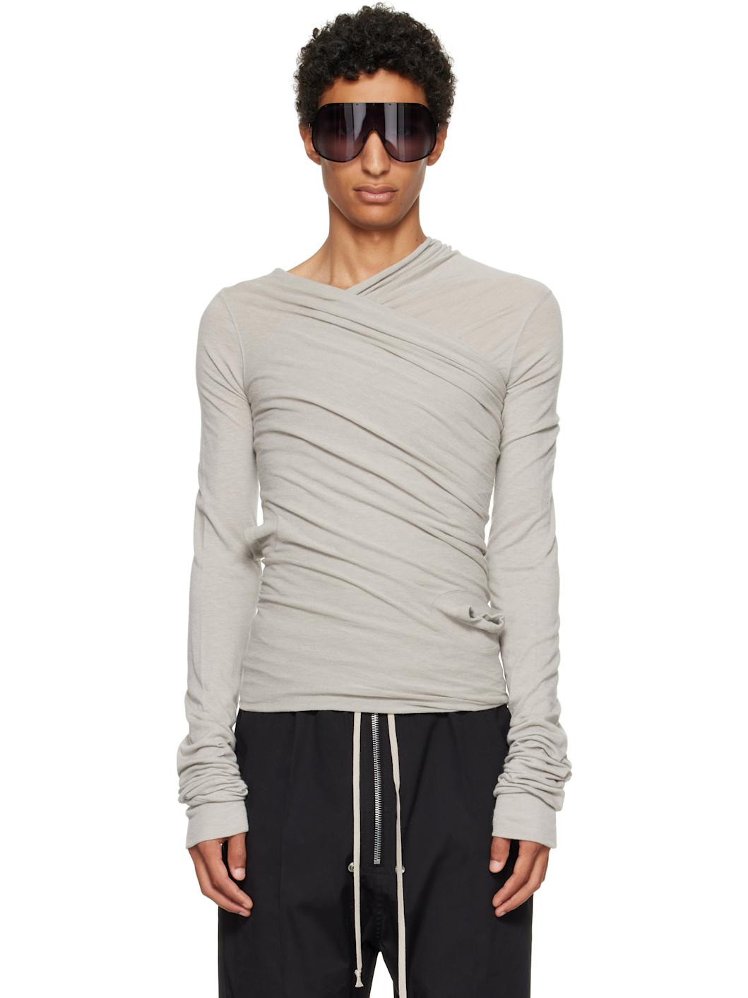 Viscose- and wool-blend jersey T-shirt. · FSC®- and RWS-certified · Layered construction · Draping throughout · Crisscrossing V-neck · Rib-knit cutouts at front · Rib-knit cuffs · Offset seam at back Supplier color: Pearl 30% polyamide, 30% viscose, 20% angora, 20% wool. Made in Italy 252232M213037