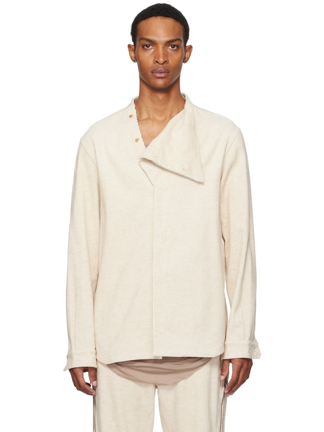 GOTS-certified organic cotton- and linen-blend corduroy shirt. · Cowl neck · Offset concealed button closure · Shirttail hem · Pleats at buttoned barrel cuffs · Buffalo horn hardware Supplier color: Natural 74% organic cotton, 26% linen. Made in Italy 252232M192019