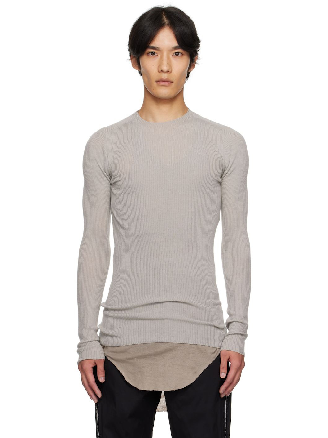 Lightweight rib-knit virgin wool sweater. · Semi-sheer · Rib-knit crewneck · Saddle shoulders · Central garter stitch stripe at back Supplier color: Pearl 100% virgin wool. Made in Italy 252232M201013