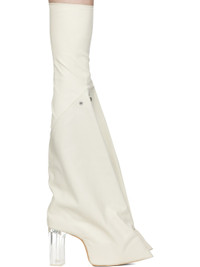 Thigh-high stretch buffed lambskin and grained calfskin boots. · LWG-certified · Pointed toe · Press-stud hardware at vamp · Elasticized collar · Plain-woven and buffed calfskin lining · Transparent plexiglass block heel · Covered platform midsole · Leather sole with rubber injection · Platform: H3" · Heel: H5.25" Supplier color: Dirty milk/Clear Upper: lambskin, calfskin. Sole: leather, rubber. Made in Italy 252232M222008