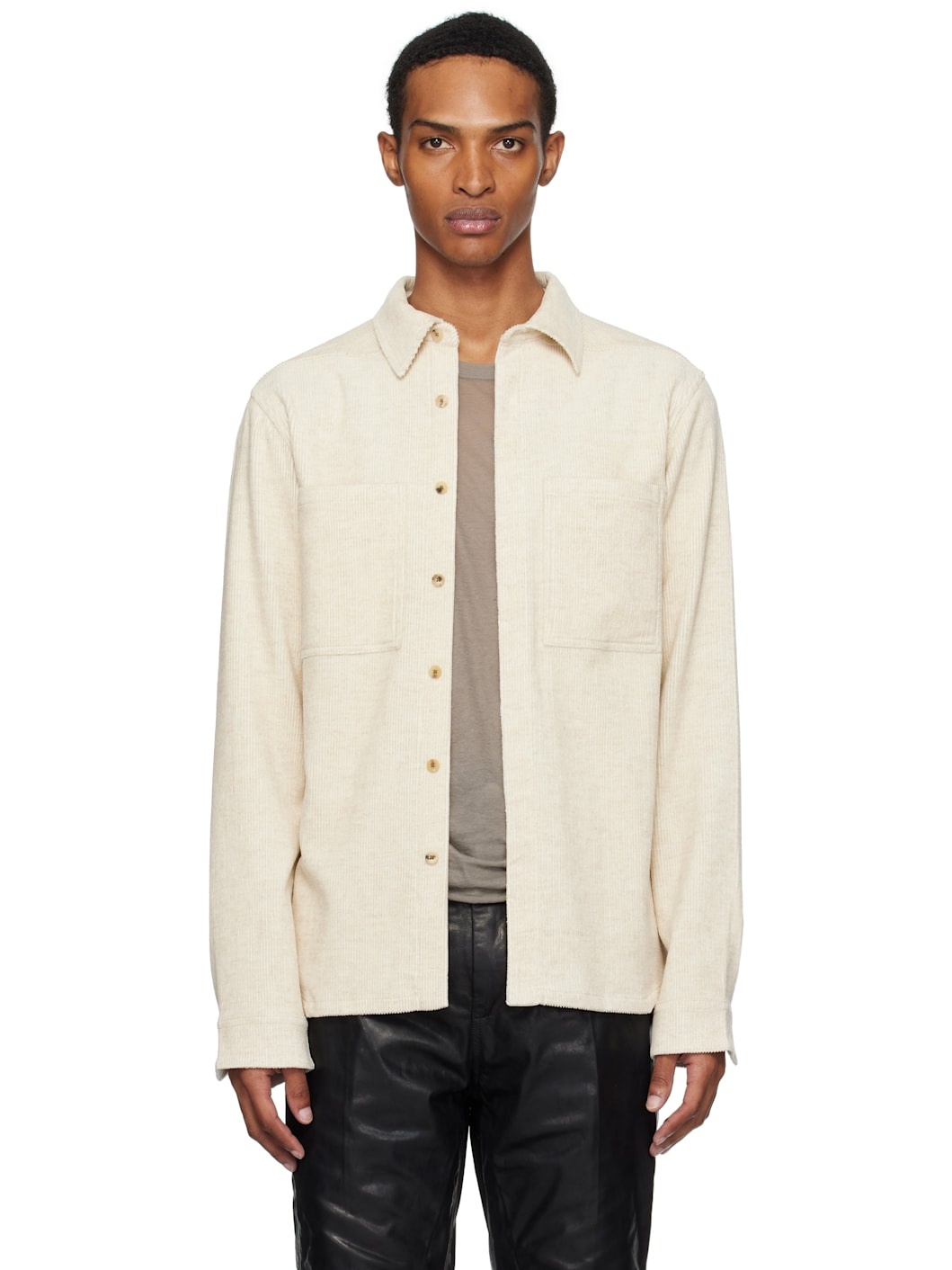 Organic cotton- and linen-blend corduroy shirt. · GOTS-certified organic cotton · Spread collar · Button closure · Patch pockets · Shirttail hem · Pleats at buttoned barrel cuffs · Buffalo horn hardware Supplier color: Natural 74% organic cotton, 26% linen. Made in Italy 252232M192030