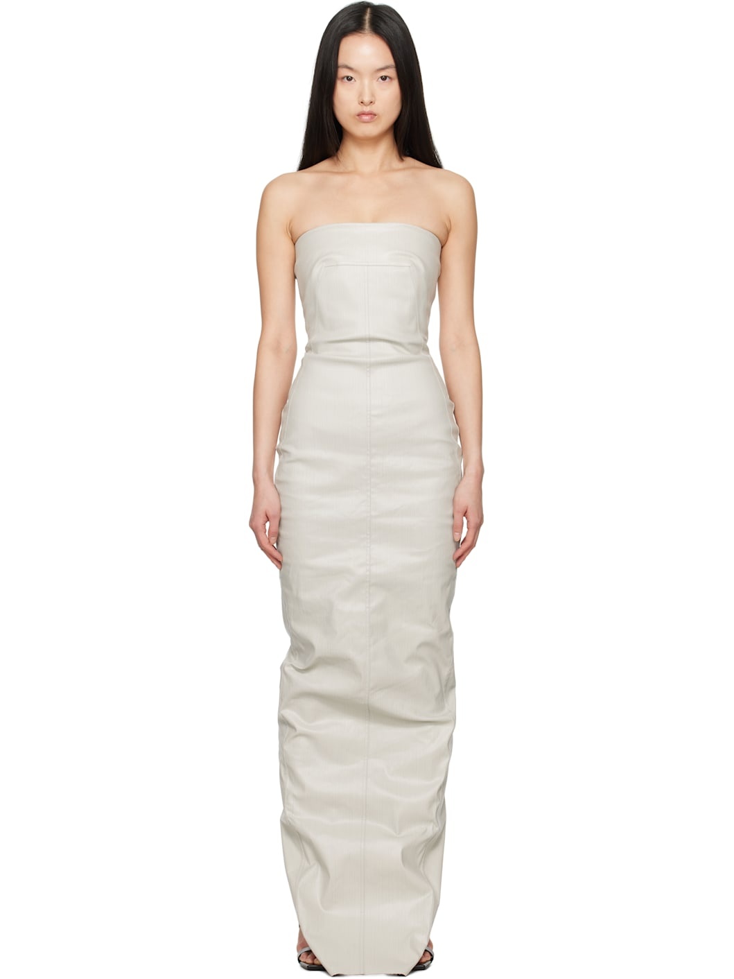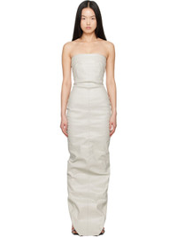 Rubber-coated stretch organic cotton denim maxi dress. · Paneled construction · Straight neck · Boning at bodice · Raw edge at tapered hem · Zip closure at back · Slit at back hem · Partial stretch mesh lining Supplier color: Dinge Body: 91% organic cotton, 6% elastomultiester, 3% rubber. Lining: 84% polyamide, 16% elastane. Made in Italy 251232F055035