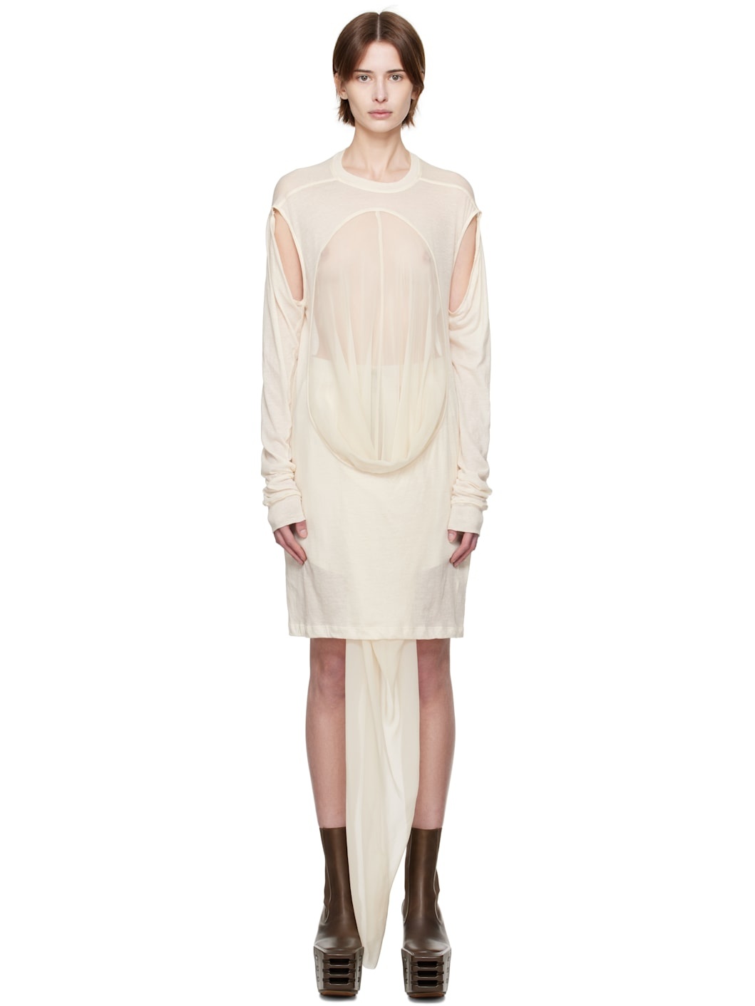 Semi-sheer slub GOTS-certified organic cotton jersey T-shirt. · Paneled construction · Rib-knit crewneck · Silk chiffon panel with draping at front · Raw edge at hem · Cutout at armscyes for alternate styling Supplier color: Natural/Dinge Body: 100% organic cotton. Trim: 100% silk. Made in Italy 251232F110004