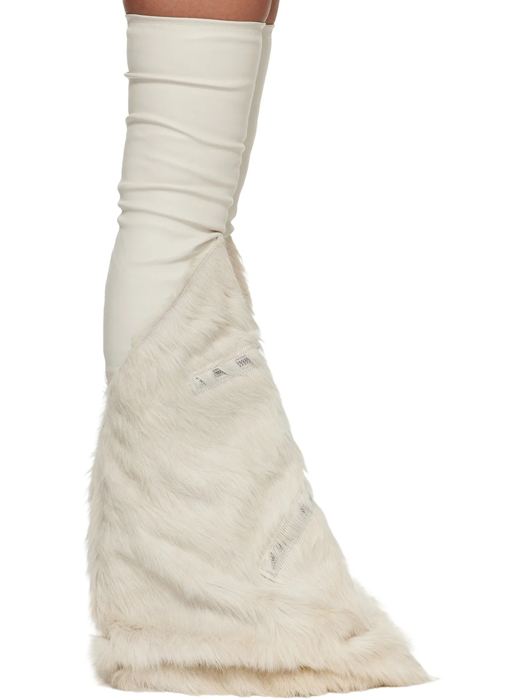 Thigh-high stretch buffed lambskin and hair-on leather boots. · Draped construction · Zip pockets at vamp · Elasticized collar · Plain-woven lining · Treaded rubber sole Supplier color: Milk/Milk Upper: lambskin, leather. Sole: rubber. Made in Italy 252232F115005