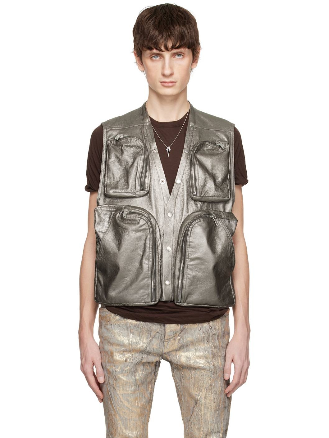 Coated blistered lambskin vest. · Lightweight · Y-neck · Press-stud closure · Zip and patch pockets · Adjustable press-stud strap at open back · Full cotton canvas lining · Silver-tone hardware Supplier color: Gunmetal Body: 100% lambskin. Lining 1: 97% cotton, 3% elastane. Lining 2: 100% cotton. Made in Moldova 251232M185001