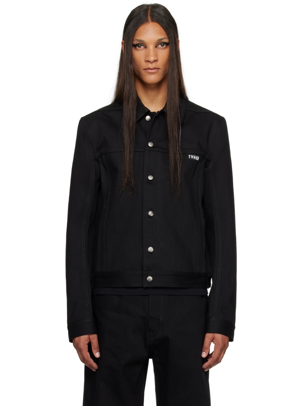 Non-stretch denim jacket. · Spread collar · Button closure · Logo patch at chest · Welt pockets · Single-button barrel cuffs · Logo printed at back · Adjustable button tabs at back hem · Partial satin lining Part of the RICK OWENS\KEMBRA PFAHLER collaboration. Part of the SSENSE XX exclusive offering. Supplier color: Black/Milk