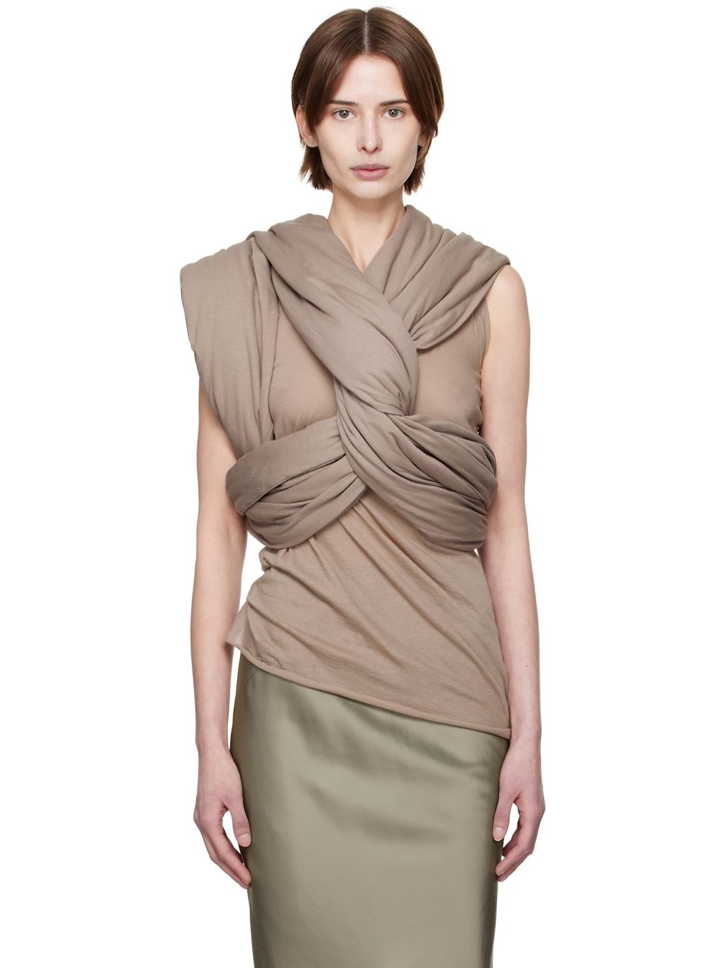 Padded GOTS-certified organic cotton jersey top. · Twisted detailing throughout · Asymmetrical and layered construction Supplier color: Taupe Body: 100% organic cotton. Fill: 100% polyester. Made in Italy 251232F111042