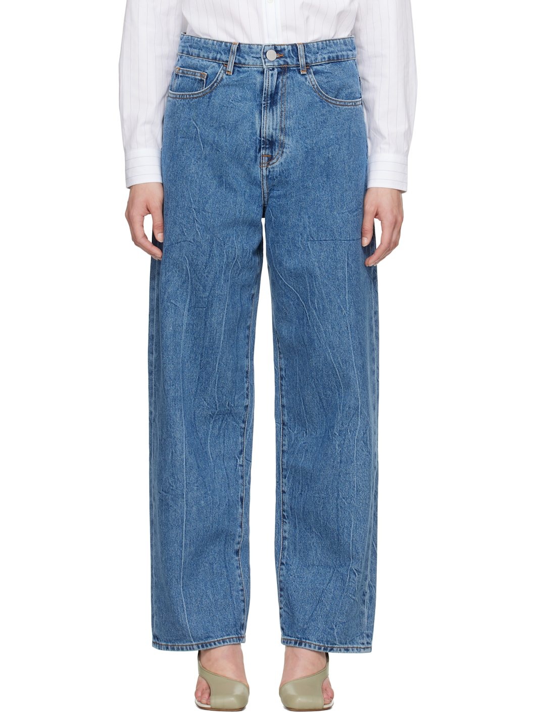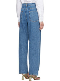 Loose-fit and wide-leg non-stretch denim jeans. Fading and whiskering throughout. · Low-rise · Belt loops · Five-pocket styling · Zip fly · Logo-engraved silver-tone hardware · Contrast stitching in tan Supplier color: Mid denim blue 100% cotton. Made in Tunisia 251144F069023