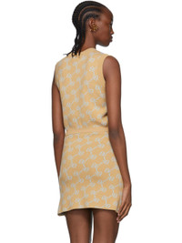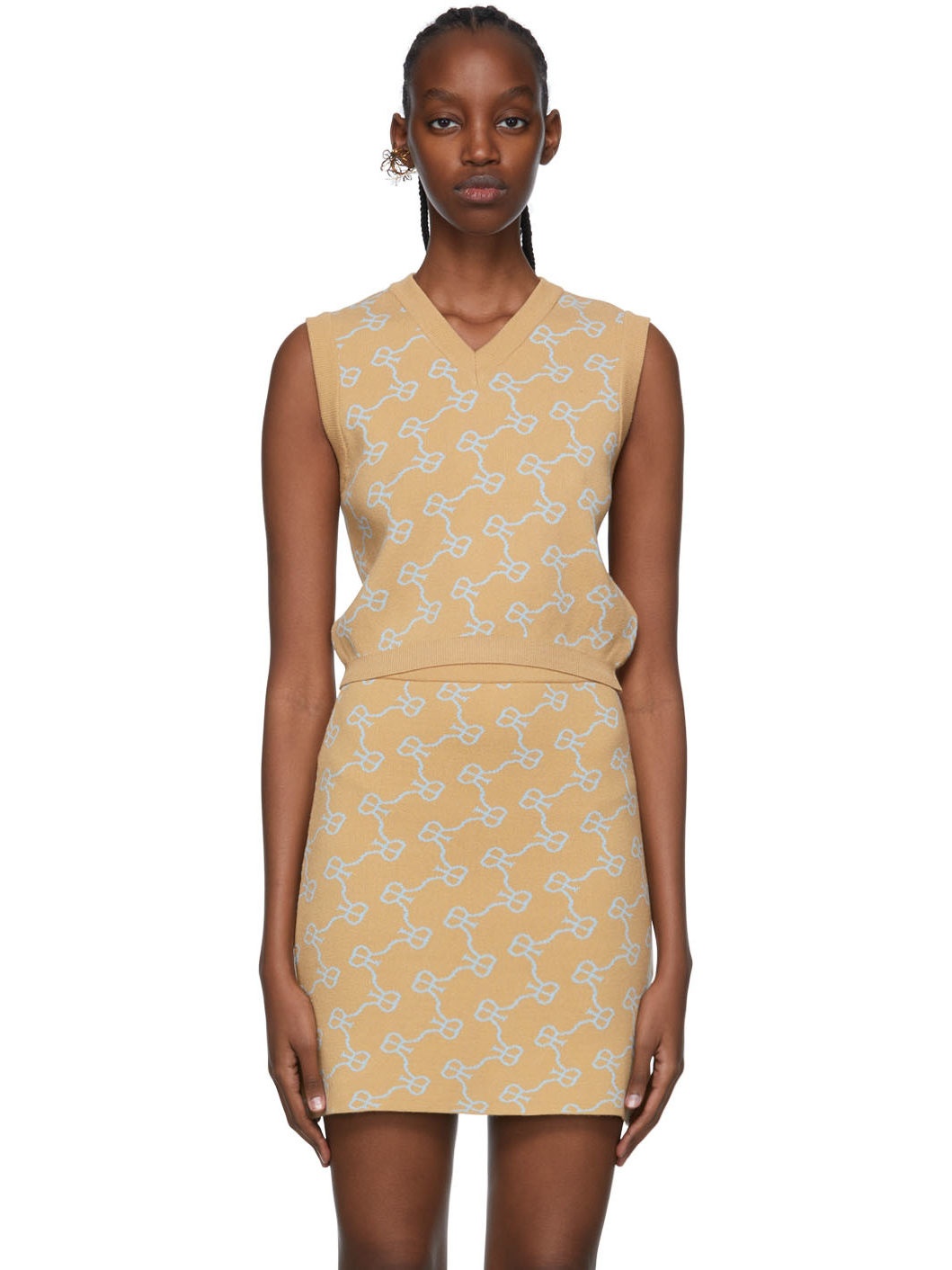 Knit viscose-blend vest. · Rib knit V-neck, armscyes, and hem · Jacquard knit graphic pattern throughout Supplier color: Camel/Blue emblem 70% viscose, 30% polyester. Made in Portugal 221151F068000
