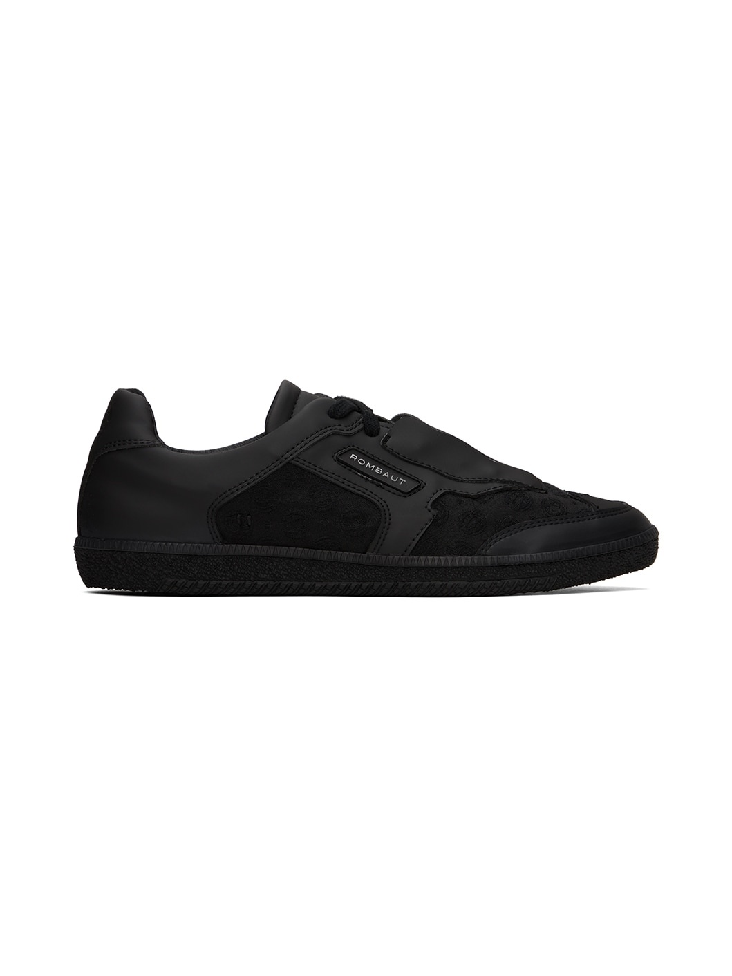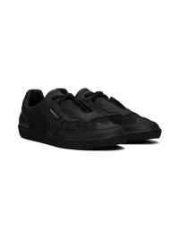 Handcrafted low-top paneled buffed faux-leather and twill sneakers in black. · Jacquard logo pattern throughout · Lace-up closure · Logo embossed at vamp and tongue · Eyelets at inner side · Rubberized logo patch at outer side · Grained faux-leather lining · Treaded TPU sole Supplier color: Black Upper: synthetic, textile. Sole: thermoplastic polyurethane. Made in Portugal 241654M237006
