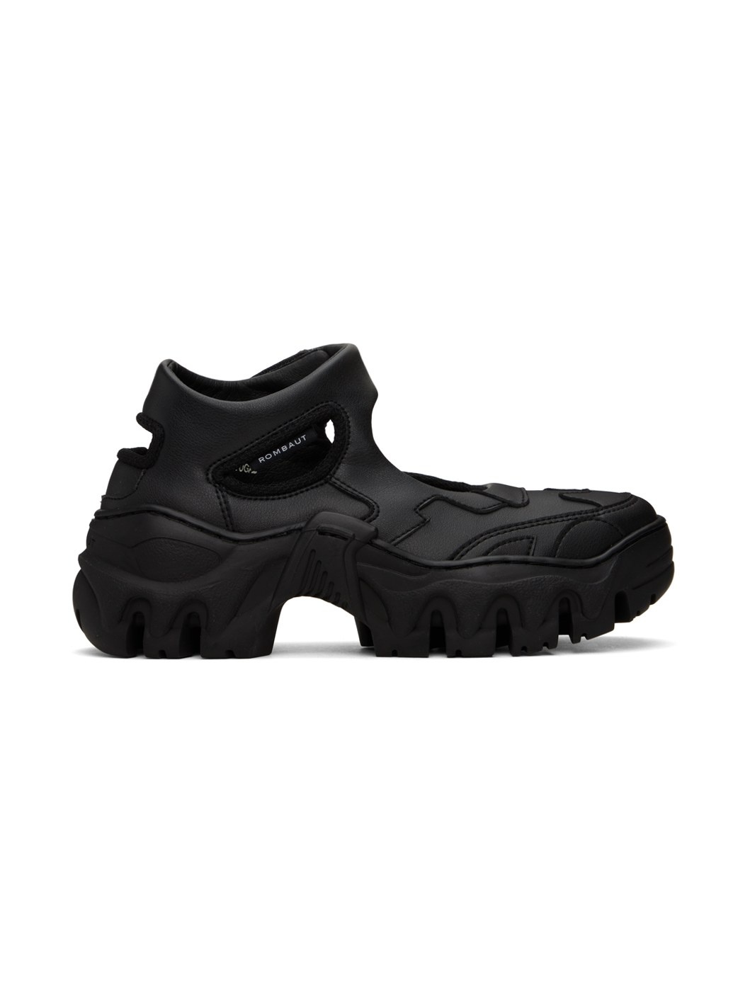 Handcrafted low-top paneled buffed faux-leather sneakers in black. · Velcro ankle strap · Cutout at heel and outer side · Mesh lining · Treaded sculptural TPU platform sole · Platform: H2" Supplier color: Black beyond leather Upper: synthetic. Sole: thermoplastic polyurethane. Made in Portugal 241654F128009