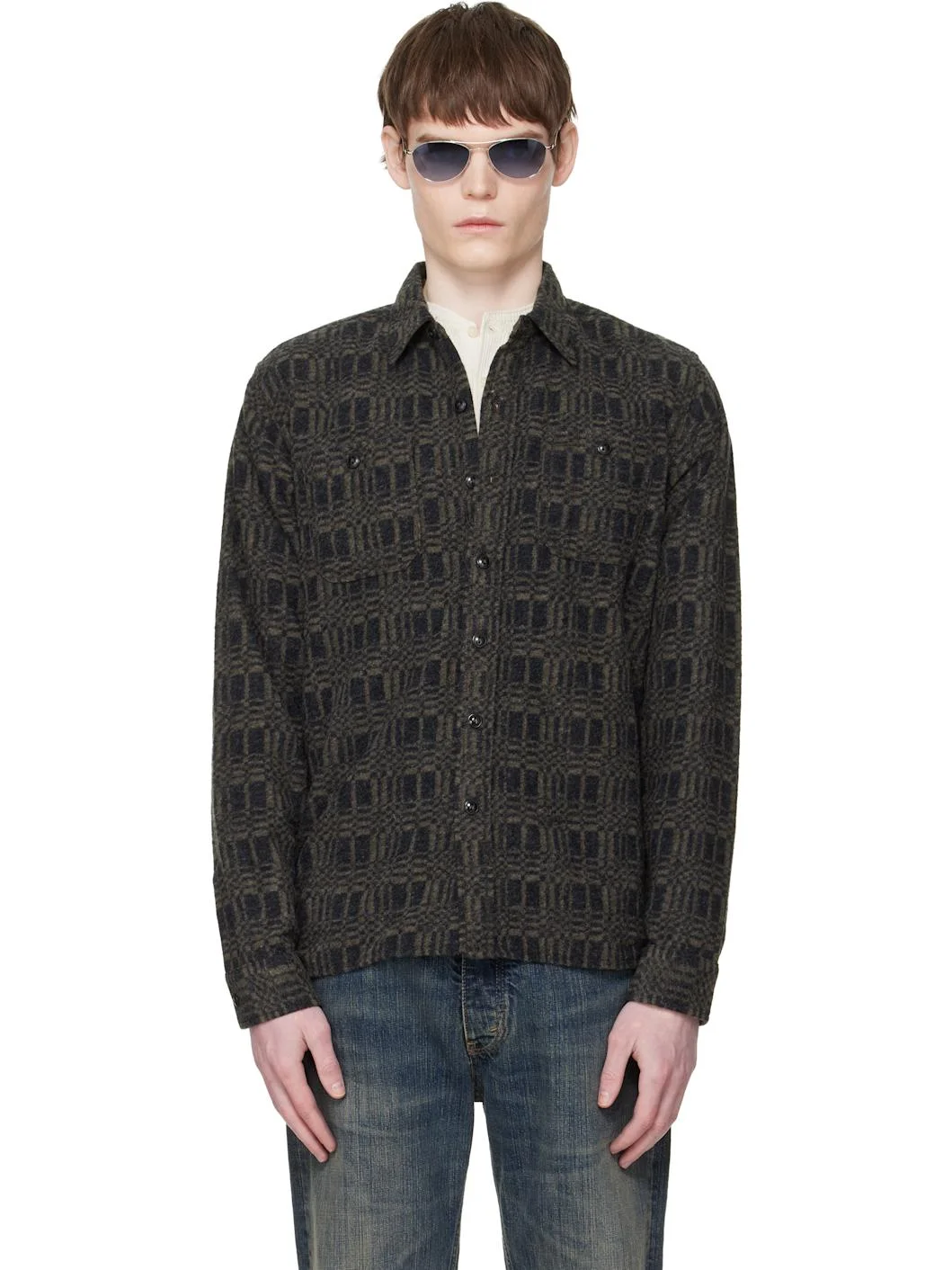 Wool-blend melton shirt. · Jacquard graphic pattern throughout · Spread collar · Button closure · Patch pockets at chest · Shirttail hem · Buttoned barrel cuffs Supplier color: Charcoal/Multi 55% wool, 25% polyester, 20% cotton. Made in Viet Nam 261435M200002