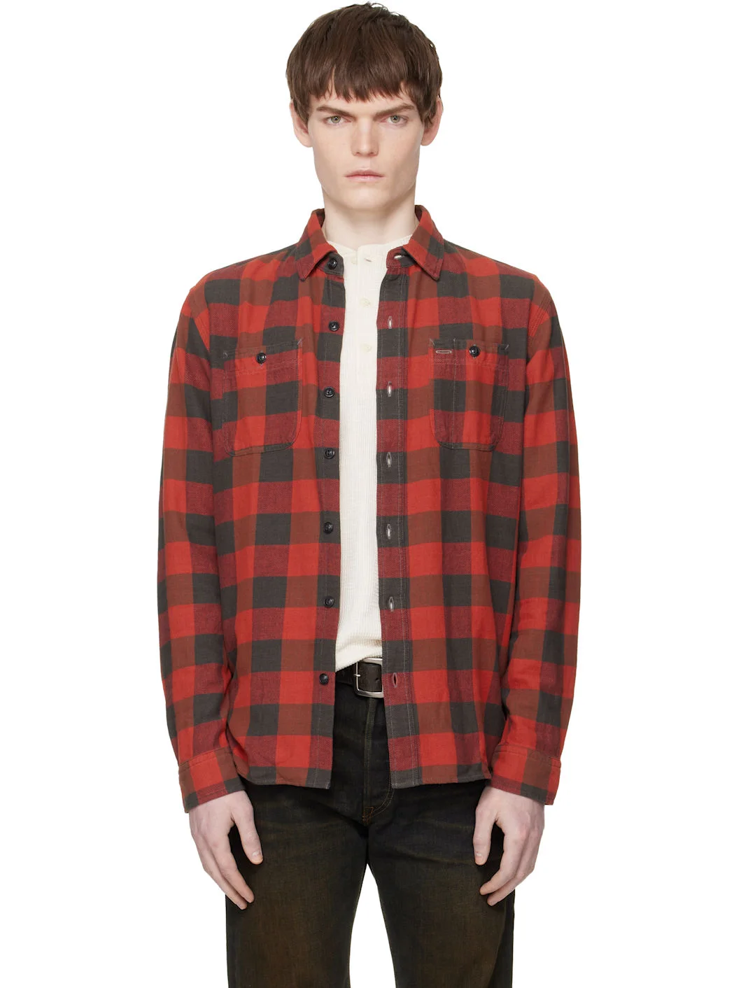Cotton flannel shirt. · Check pattern throughout · Spread collar · Button closure · Patch pockets at chest · Shirttail hem · Buttoned barrel cuffs Supplier color: Red/Black 100% cotton. Made in India 261435M192013