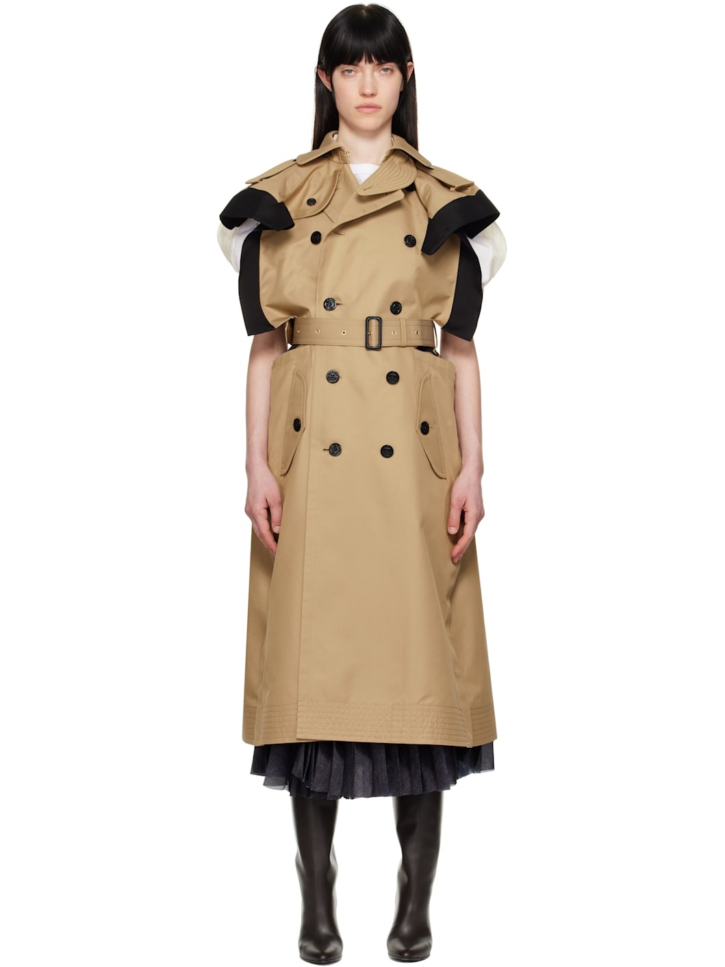 Cotton-blend gabardine and silk-blend faille trench coat. - Paneled and layered construction - Button throat guard at spread collar - Double-breasted button closure - Detachable pin-buckle belt - Flap pockets - Epaulets - Box pleat at back yoke - Gusset at back hem Supplier color: Beige/Black