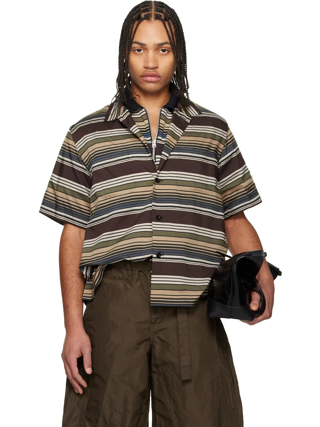 Faille shirt. · Semi-sheer · Stripes throughout · Spread collar · Button closure · Patch pockets at chest · Tennis-tail hem · Logo-engraved hardware Supplier color: Brown/Beige Body: 100% polyester. Trim: 100% cupro. Made in Japan 261445M192006