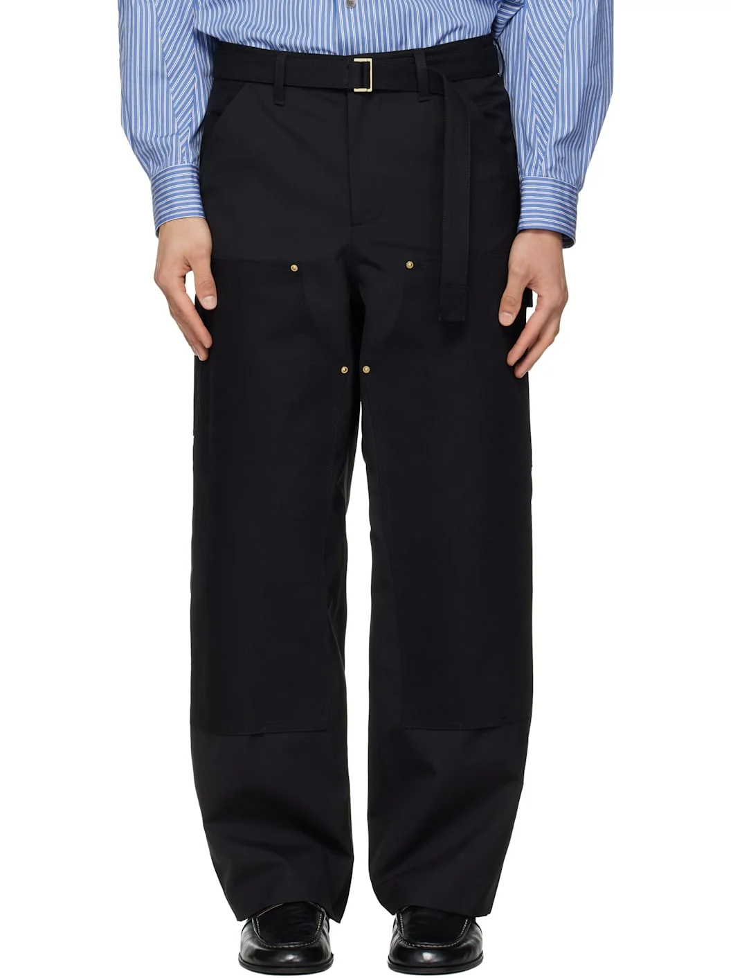 Plain-woven wool-blend trousers. · Cotton canvas trim throughout · Belt loops and detachable cinch belt at waistband · Four-pocket styling · Zip fly · Patch pockets at outseam · Hammer loop and patch pocket at outseam · Logo patch at back pocket · Full satin lining Part of the sacai x Carhartt Work In Progress collaboration. Supplier color: Black Body: 70% polyester, 30% wool. Trim: 100% cotton. Lining: 100% cupro. Made in Japan 261445M191030